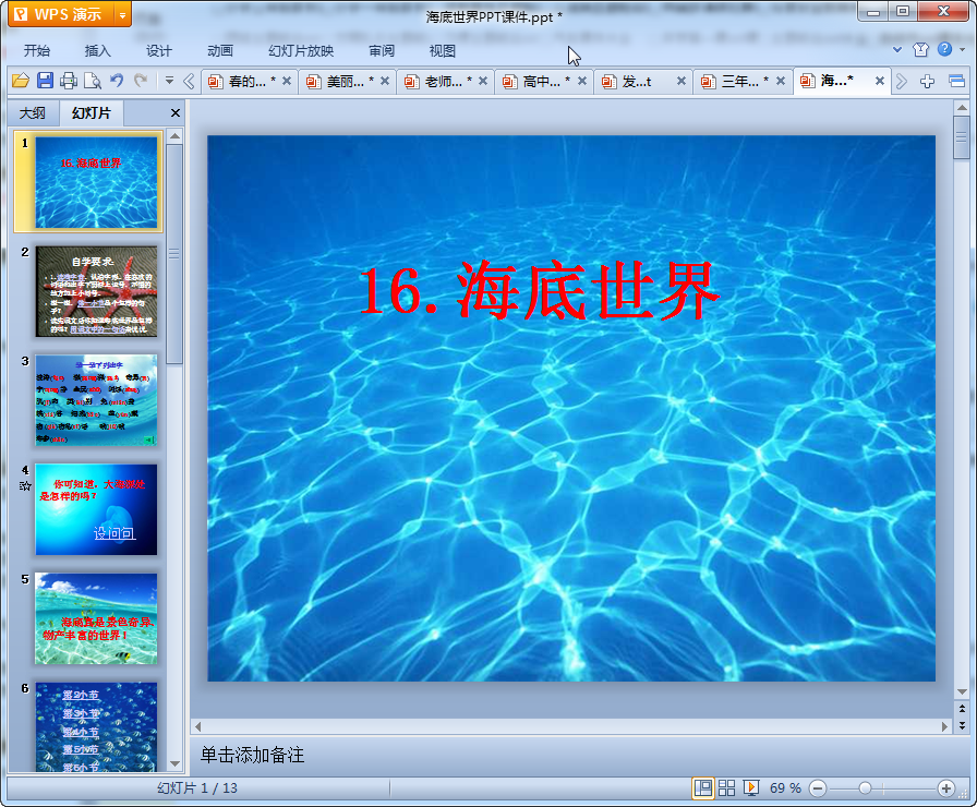 这是由东坡下载编辑整理的海底世界教学课件,课件共有13页内容丰富对课文的讲解非常详细,让学生们在学习的过程中也了解了海洋的知识,加上精美的海底背景图片什深受学生们的喜爱,有需要的老师可以来我们东坡免费的下载使用!
