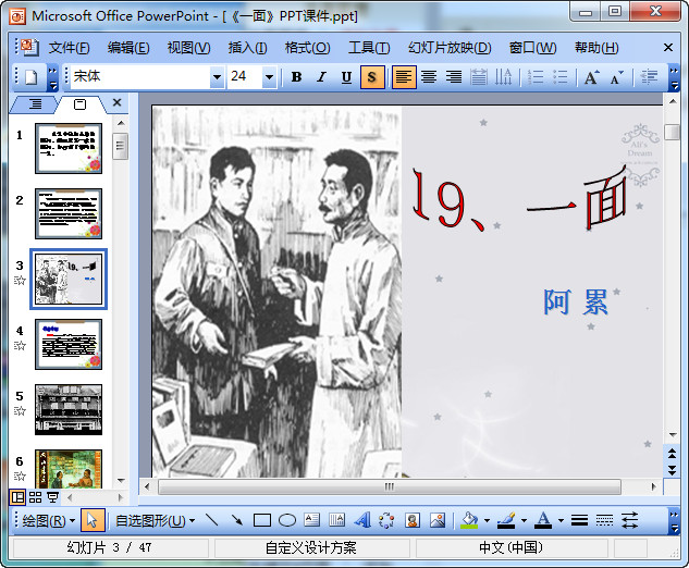 师:同学们,前面几节课我们学习了《少年闰土》和《我的伯父鲁迅先生》,我们对鲁迅先生有了初步的了解鲁迅先生在他短暂的一生中做了许多让人难忘的事情,以他高尚的人格魅力、坚定的斗争精神和犀利的批判文笔影响了千千万万的人以至有这样一个人,因为鲁迅与他的一面之交而感念不已今天,我们就来学习这个关于鲁迅先生的故事(板书课题:一面,让学生齐读课题)