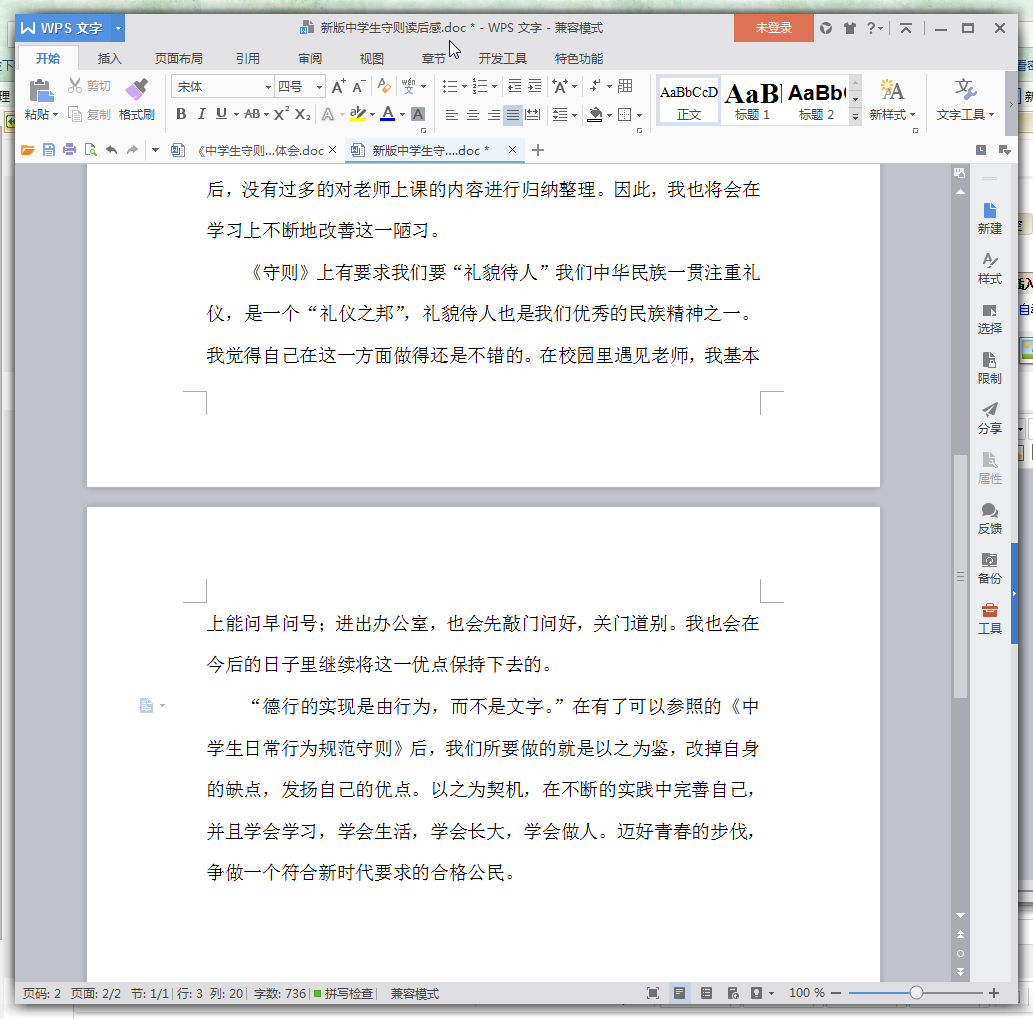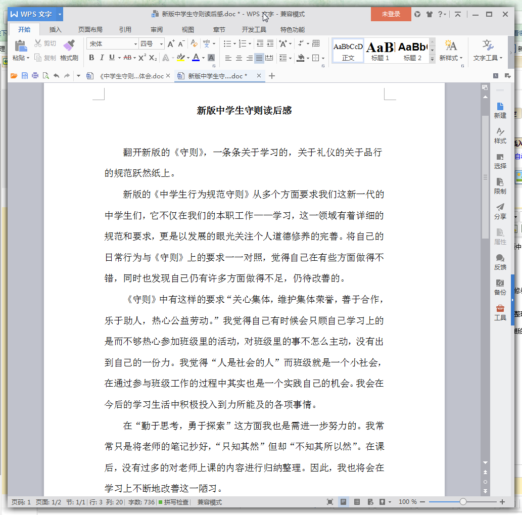 新版的《中学生行为规范守则》从多个方面要求我们这新一代的中学生们,它不仅在我们的本职工作——学习,这一领域有着详细的规范和要求,更是以发展的眼光关注个人道德修养的完善。将自己的日常行为与《守则》上的要求一一对照,觉得自己在有些方面做得不错,同时也发现自己仍有许多方面做得不足,仍待改善的