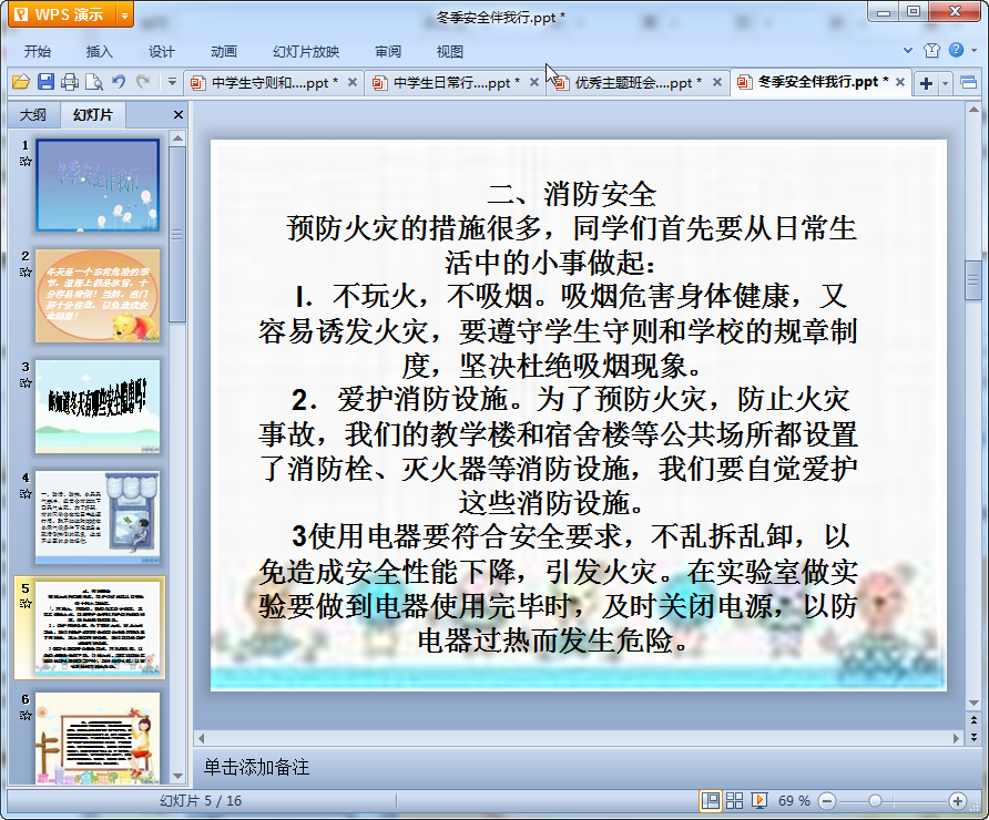 2.爱护消防设施。为了预防火灾,防止火灾事故,我们的教学楼和宿舍楼等公共场所都设置了消防栓、灭火器等消防设施,我们要自觉爱护这些消防设施。