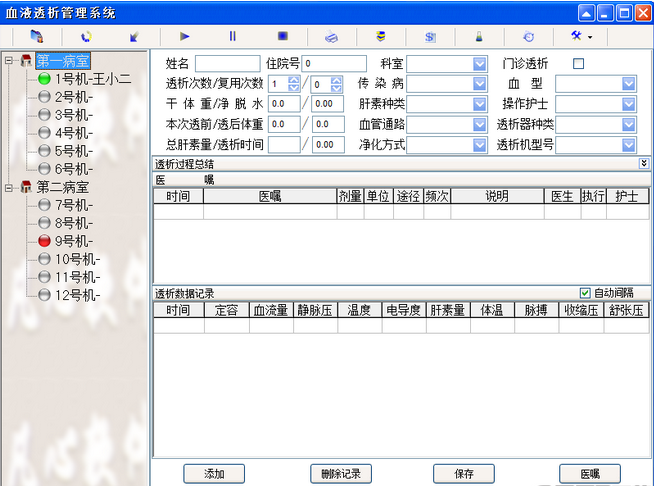 血液透析管理系统是一款可以完整解决血液透析过程中主要参数的设置、记录。自动安排透析时间,透析机器,自动计算患者相关数值,完成血液透析费用,透析患者治疗、病历的管理。极大减少透析室医务人员工作强度。可实现透析室的无纸化管理的软件。