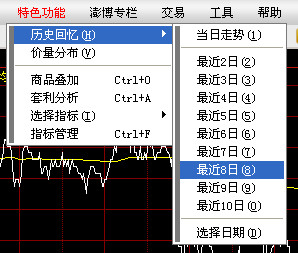 1.点击菜单栏上的 “特色功能”,选择“历史回忆 ”,在下拉菜单中可以选择最近X日(如图1),进入历史回忆图之后,当天的分时走势以黑底显示,历史走势以灰底显示(如图2);也可以点击“选择日期”,选择某一个历史交易日(如图3)。