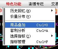 1.分时图界面单击右上角的“商品叠加”→“选择商品”(如图6);或者点击菜单栏中的“特色功能”,在下拉菜单中选择“商品叠加”(如图7).