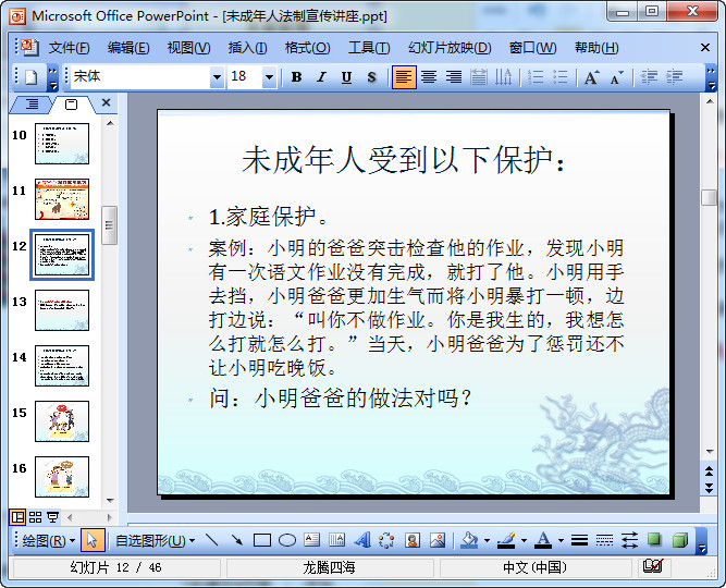 2015未成年人法制宣传讲座ppt课件,总共有46页,是一份非常精彩的讲述未成年人法律的宣传课件。重点讲述了法的概念含义、未成年人保护法、预防未成年人犯罪法等内容。