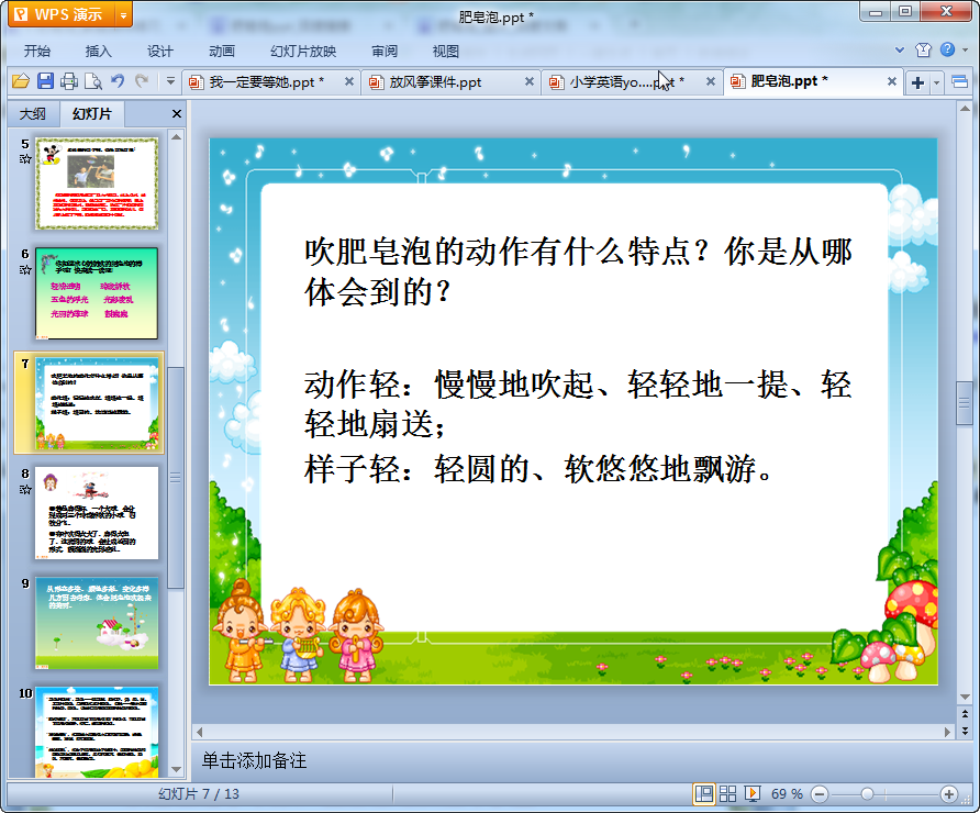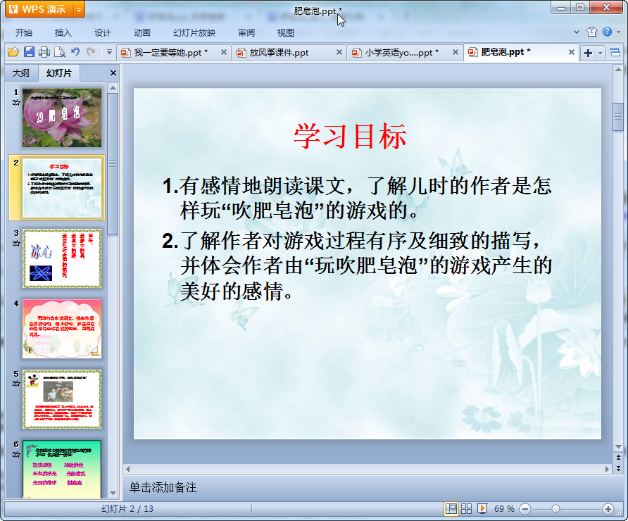 2.了解作者对游戏过程有序及细致的描写,并体会作者由“玩吹肥皂泡”的游戏产生的美好的感情。