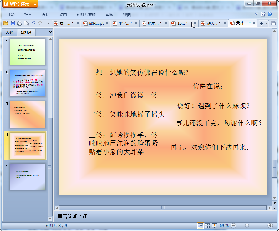 这是一篇小学语文曼谷的小象ppt课件,课件共有9页制作十分简洁但对课文中的内容讲解十分详细,不浮夸深受学生们喜欢,有需要的老师们可以来我们东坡免费的下载使用!