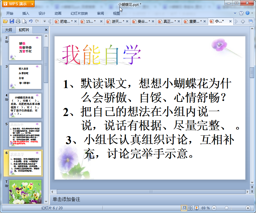 1、默读课文,想想小蝴蝶花为什么会骄傲、自馁、心情舒畅?