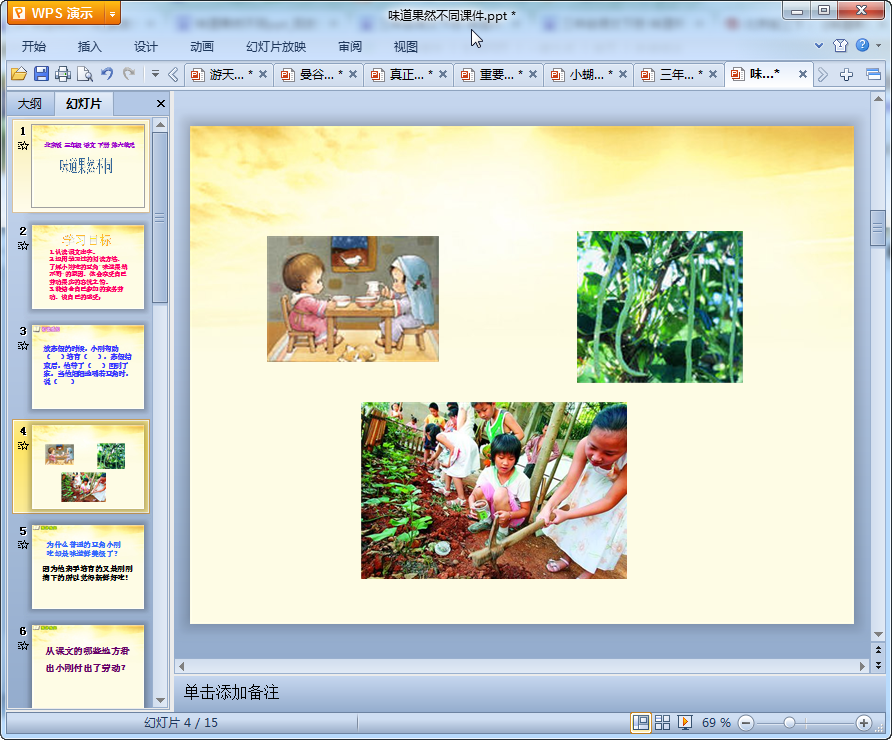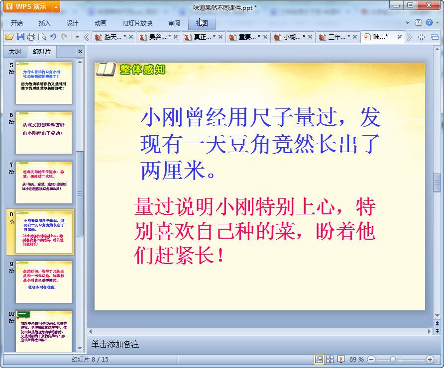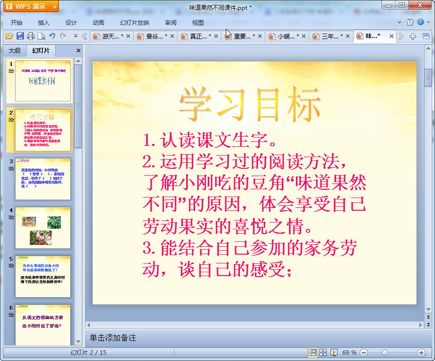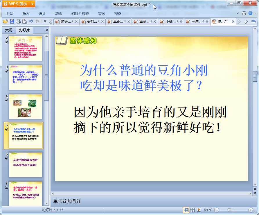 这是一篇共15页的ppt课件,课件内容制作简单,讲述了课文中小刚吃的豆角“味道果然不同”的原因,体会享受自己劳动果实的喜悦之情,对引导孩子们的自己动手有很大的帮助,有需要的老师们可以来我们东坡下载站免费的下载这篇味道果然不同教学课件吧!