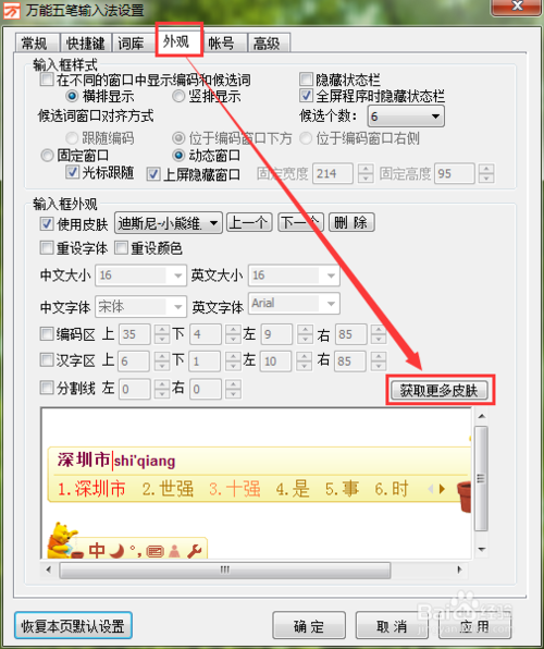 皮肤设置弹出来的对话框里,点击【外观】→【获取更多皮肤】。