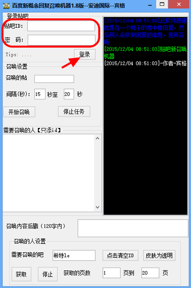 打开软件后,登陆自己的百度账号,下面有个召唤的贴,输入这个贴吧的ID,填上多久召唤一次,点击开始召唤即可!