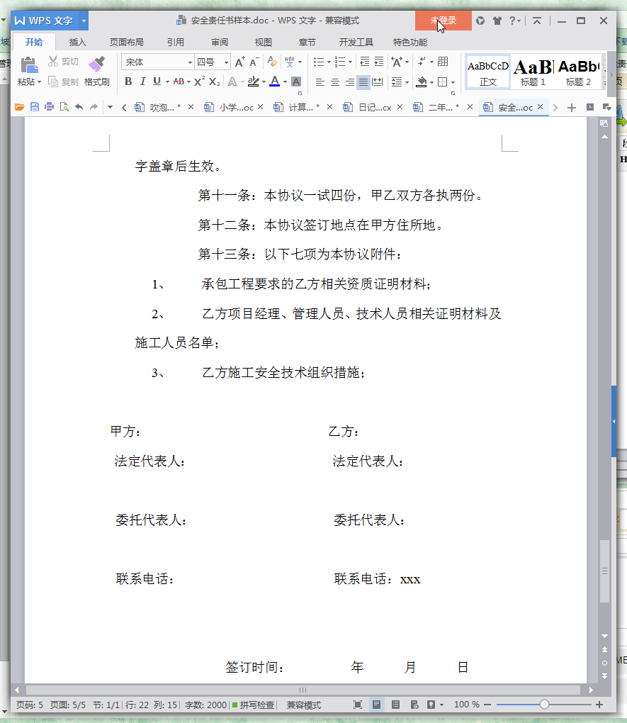为贯彻“安全第一,预防为主”方针,明确双方的安全责任,确保施工中人身、财设施设备安全,根据国家有关法律法规,经双方协商一致签订协议。