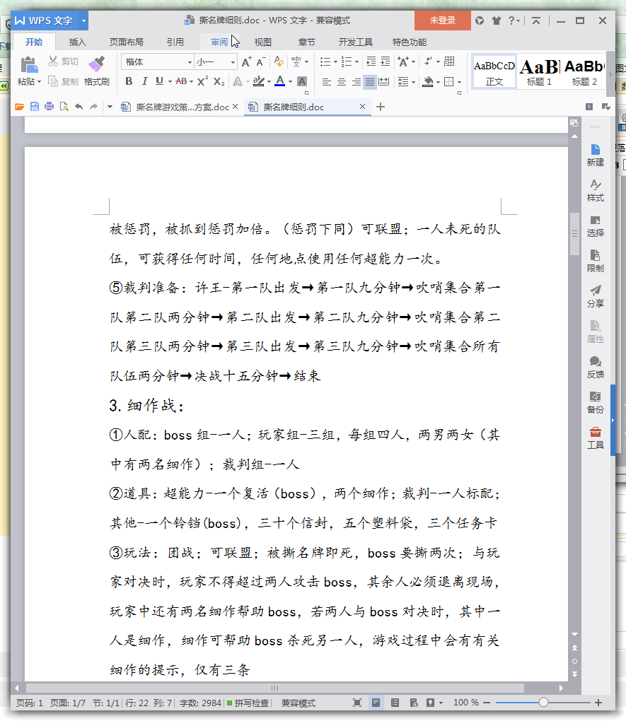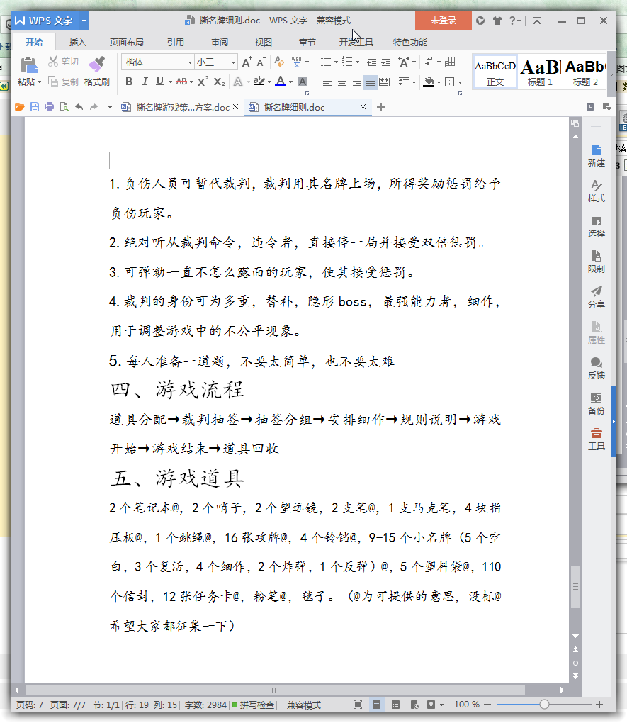 ②道具:超能力-一个复活(boss),两个细作;裁判-一人标配;其他-一个铃铛(boss),三十个信封,五个塑料袋,三个任务卡