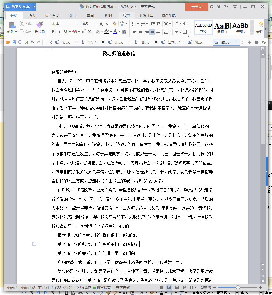 学生给老师的道歉信范文预览
