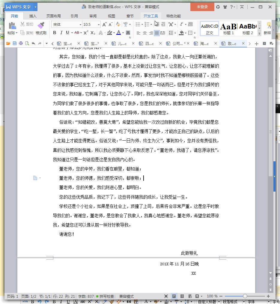 您知道,我的个性一直都是都是比较直的。除了这点,我做人一向还算低调的,大学过去了2年有余,我懂得了很多,基本上没做过让您生气、让您担心、让您不能理解的的事,因为我知道什么该做,什么不该做。然而,事发当时我不知道是哪根筋搭错了。这些不该做的事已经发生了,对于其他同学来说,可能只是一句话而已。但是对于为我们操劳的您来说,我知道,它刺痛了您,让您伤心了。同时,我也深深地知道,您对同学们关怀备至,为同学们做了很多很多的事情,也争取了很多,您是我们的师长,就像亲切的长辈一样指导着我们的人生方向,您是我们人生路上的导师,我们都感激您。