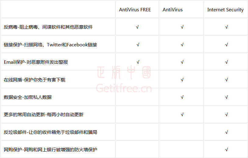 作为德国老牌杀毒软件品牌,其名誉和功劳真不是盖的。所推出的主要杀毒软件为 AntiVirus Free, Antivirus 和 Internet Security,其功能对比如下: