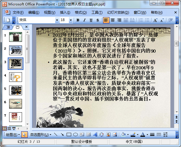 2012年1月22日,是中国人农历新年的除夕,总部位于美国纽约的非政府组织“人权观察”发表了审查全球人权状况的年度报告《全球年度报告(2012年)》。照例,它又对包括中国在内的90多个国家和地区的人权状况进行了指责。