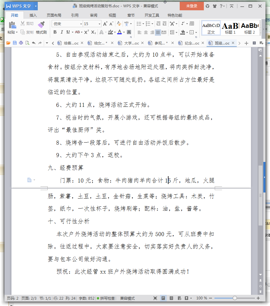 次户外烧烤活动的整体预算大约为500元,可从班费中扣除。往返过程中,大家要注意安全,切实落实好负责人的义务,要与包车公司做好沟通。