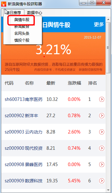 对于想要时刻了解新浪舆情牛股的信息的朋友来说,现在这款新浪舆情牛股获取器就是你们最好的选择,它是依靠全网数据来给大家删选出最靠谱的数据,方便大家进行更好的选择!