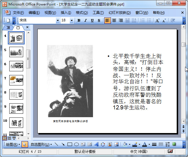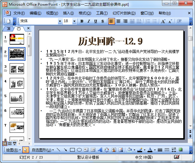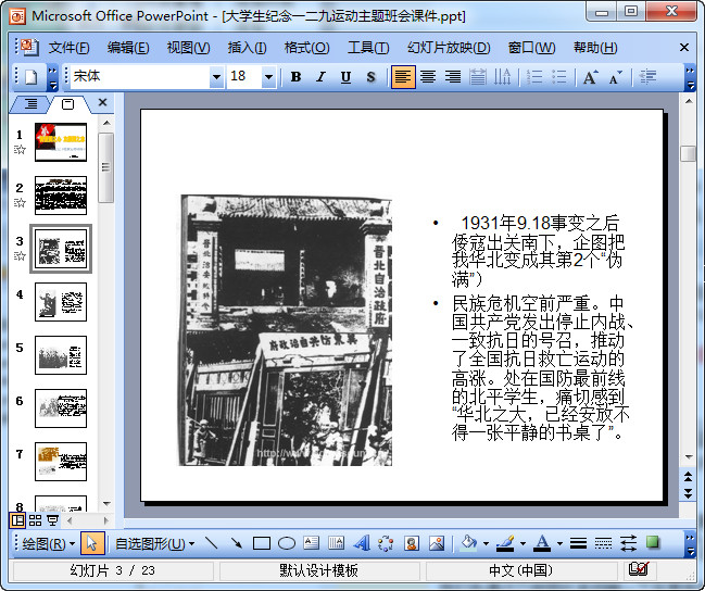 一二九运动,顾名思义就是12月9日发起的运动。这是一个非常有意义的抗战运动,是由学生领导起来的呢,这份大学生纪念一二九运动主题班会课件,总共有23页!