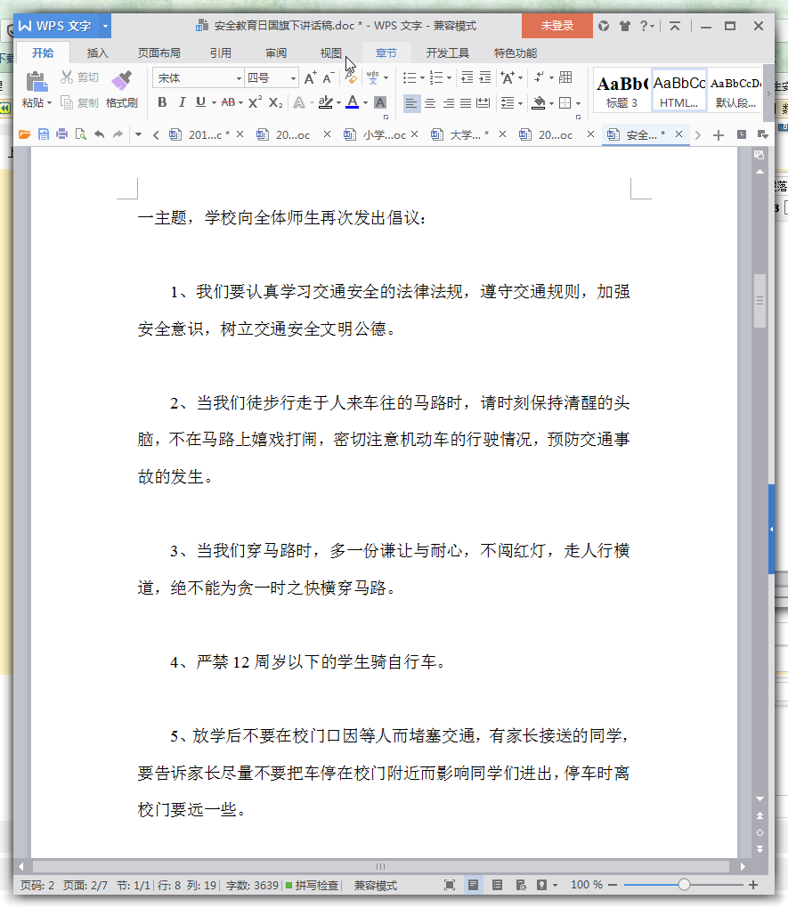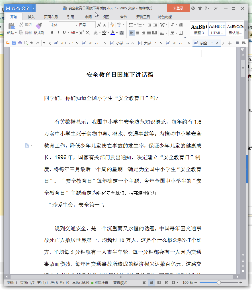 同学们,交通安全是关系到我们每一个人生命的大事,因此我们不能有丝毫的疏忽大意。为了你,为了他,为了大家,我们要牢固树立交通安全意识,自觉遵守交通法规,掌握交通安全知识,提高自我保护能力。
