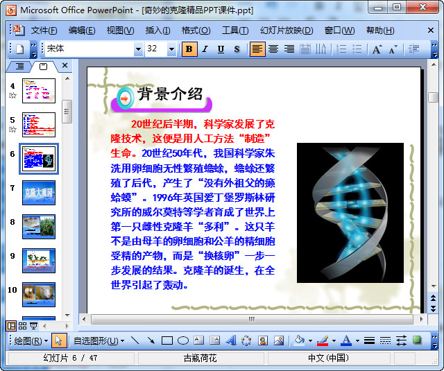 奇妙的克隆ppt精品课件,总共有46页,非常的经典。告诉小朋友们什么是克隆,了解我国的一些科技知识,对培养科技人才很有用哦。欢迎前来东坡下载使用!