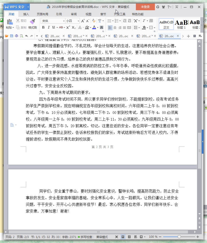 春节将至,遵照上级安排下周开始进行期未考试,考试结束后即进入寒假。下学期正月二十上午8:00前到校上课。今天,我们在这里召开这次假期前的专题安全教育专题会目的是为了使全校师生过上一个平安、快乐、文明、祥和、健康、有益的寒假和春节。安全教育涉及到的内容很多,我想从以下几个方面重点讲一下寒假和春节期间应注意的问题。