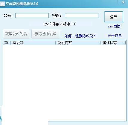 Zim空间说说删除器目前还暂不支持批量删除,只能单个删除 而有的用户需要删除上百上千条说说,删除多了还会出现验证码的情况使用本软件,只需输入帐号密码,单击按钮,程序自动替您删除空间内的全部说说,并且不用验证码.操纵方便,简单。
