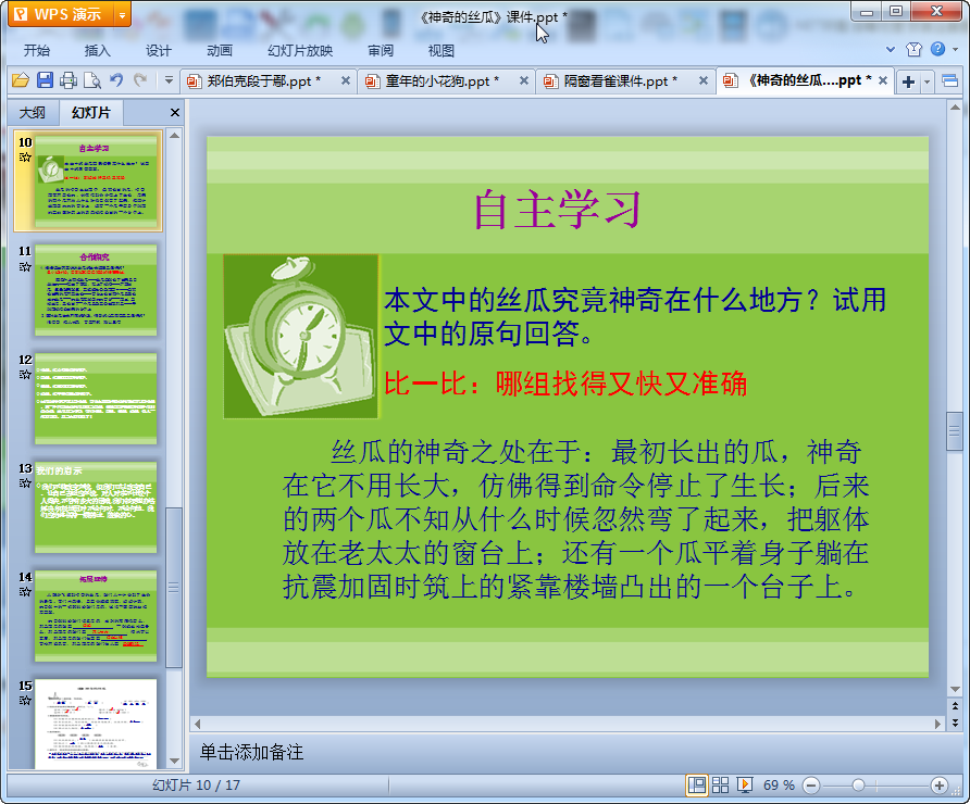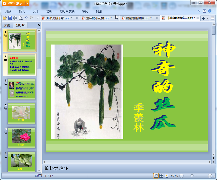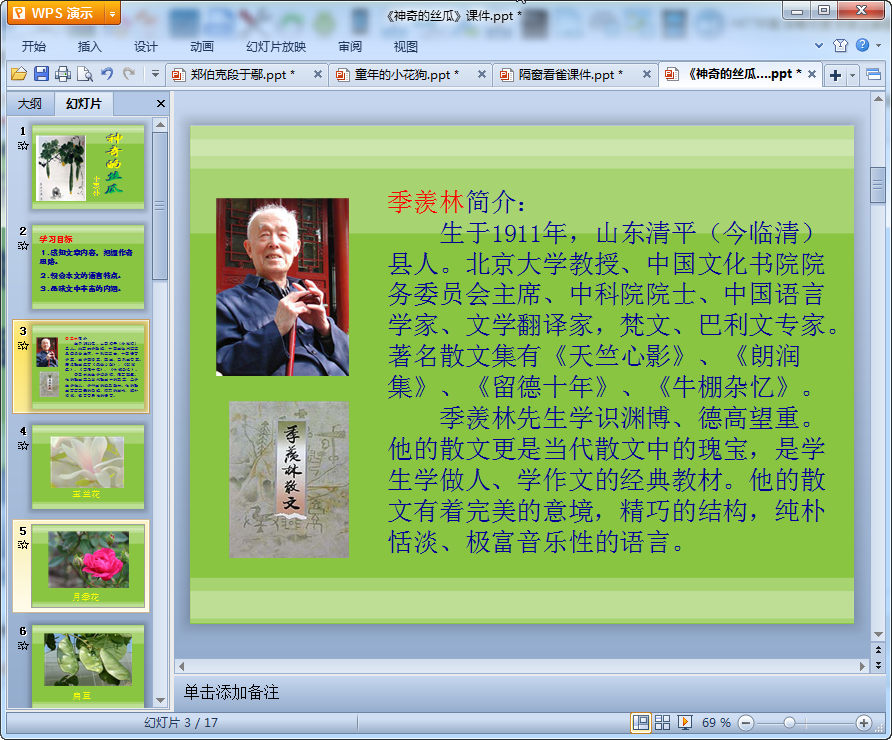这十篇小学六年级语文课件神奇的丝瓜ppt,课件共由17页组成,内容比较精美对作者季羡林做出了一系列的介绍,附加上精美的配图深受学生们的喜欢,有需要的老师快来我们东坡免费下载使用吧!