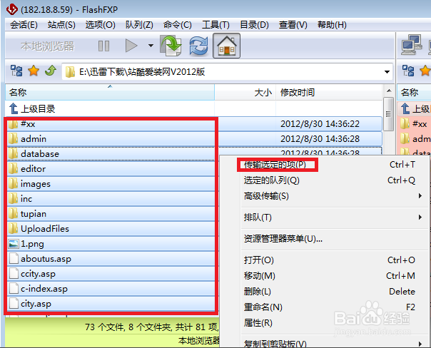 然后全选网站源码里面所有的文件,ctrl+a就可以全选了。在鼠标右键“传输选定的项”。这样就开始上传网站到自己的空间了,只要耐心的等一下。