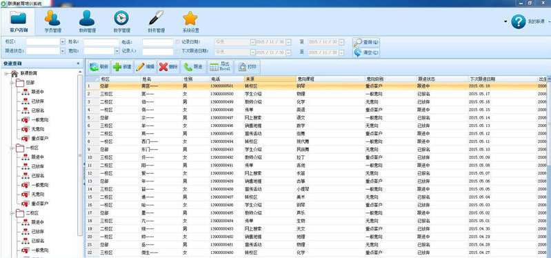 2.学员管理模块是对学员基本信息建立和快速查找,签到指纹登记、分课程校区多视角浏览,数据导出Excel等。