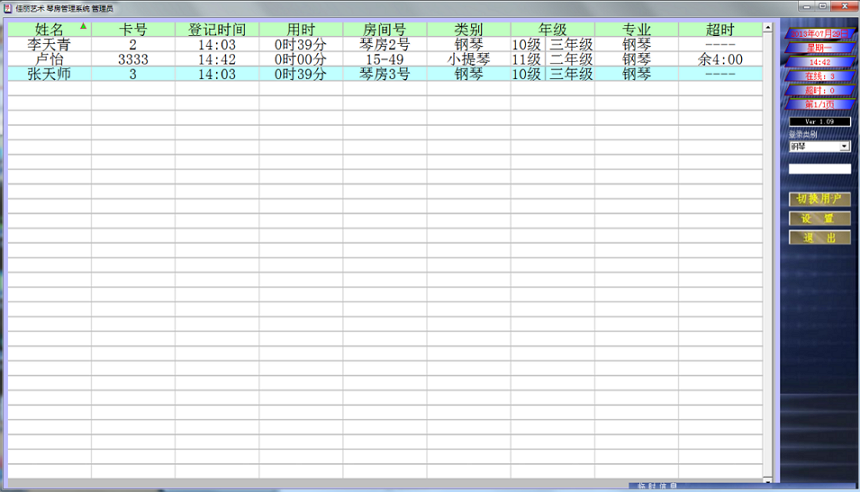 计时收费:学校对不同专业或年级学生可以统一分配琴时,如:可以统一在系统中指定一学期分配给09级声乐系每个学生200个琴时,如果学生琴时用完,可以充值购买琴时,琴房同时可以对外开放。