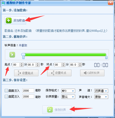 (3)点击“添加歌曲”加入自己想截取的歌曲,再设置开始和结束的时间,最后点击“保存”即可。