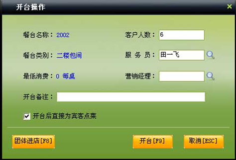 1.宾客进店开台:选中可供餐台 -> 单击开台 -> 输入人数、服务员信息 -> 点击【开台】按钮完成开台操作,如图。