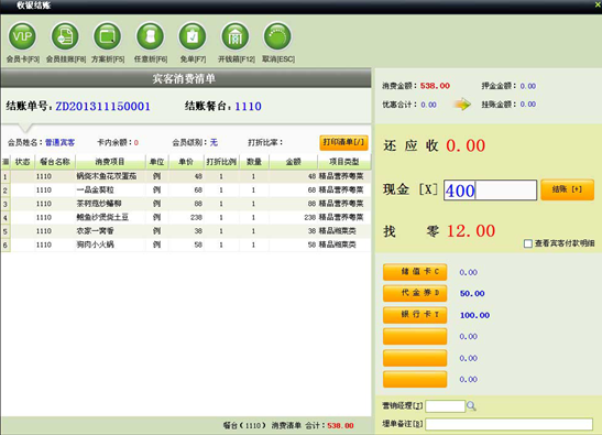 (6) 支持免单操作,即在结账时直接免付部分付款金额。