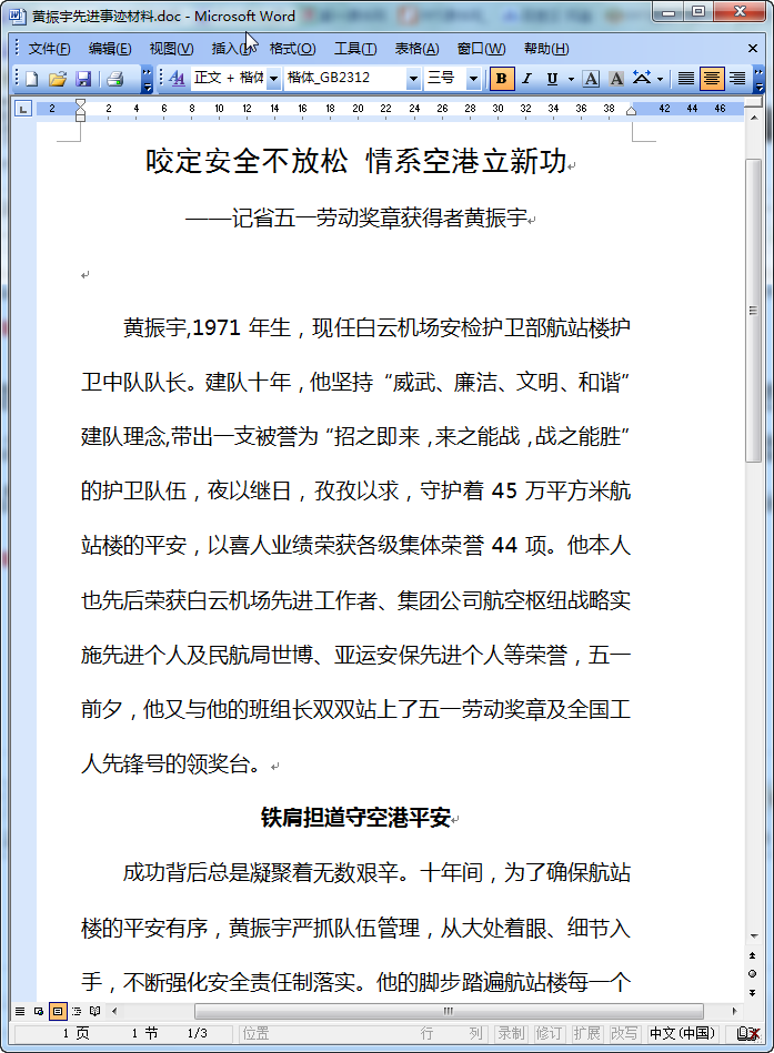 黄振宇,1971年生,现任白云机场安检护卫部航站楼护卫中队队长。建队十年,他坚持“威武、廉洁、文明、和谐”建队理念,带出一支被誉为“招之即来,来之能战,战之能胜”的护卫队伍,夜以继日,孜孜以求,守护着45万平方米航站楼的平安,以喜人业绩荣获各级集体荣誉44项。他本人也先后荣获白云机场先进工作者、集团公司航空枢纽战略实施先进个人及民航局世博、亚运安保先进个人等荣誉,五一前夕,他又与他的班组长双双站上了五一劳动奖章及全国工人先锋号的领奖台。