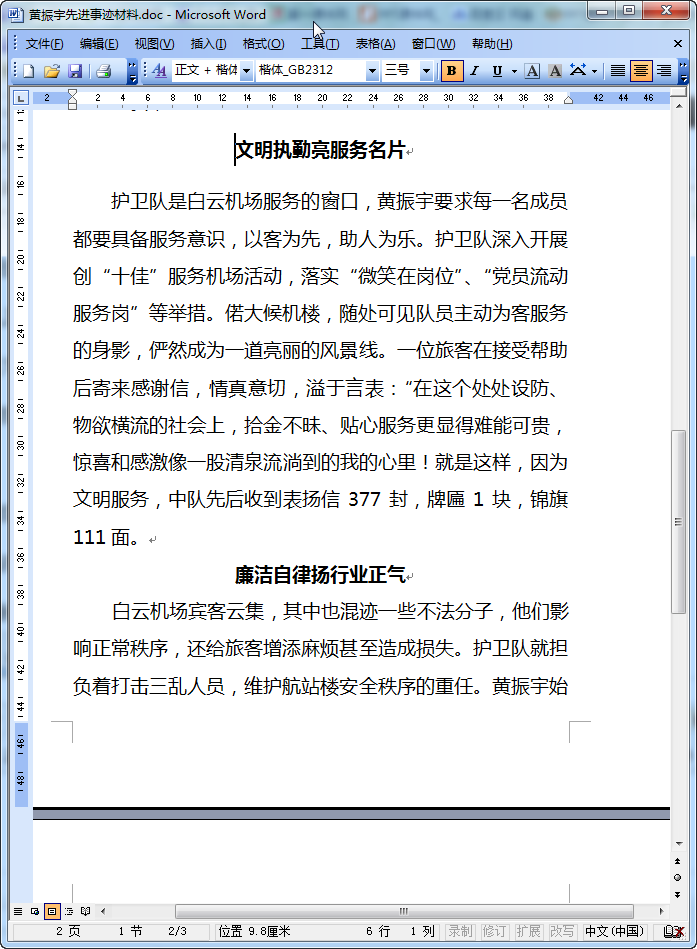 护卫队是白云机场服务的窗口,黄振宇要求每一名成员都要具备服务意识,以客为先,助人为乐。护卫队深入开展创“十佳”服务机场活动,落实“微笑在岗位”、“党员流动服务岗”等举措。偌大候机楼,随处可见队员主动为客服务的身影,俨然成为一道亮丽的风景线。一位旅客在接受帮助后寄来感谢信,情真意切,溢于言表:“在这个处处设防、物欲横流的社会上,拾金不昧、贴心服务更显得难能可贵,惊喜和感激像一股清泉流淌到的我的心里!就是这样,因为文明服务,中队先后收到表扬信377封,牌匾1块,锦旗111面。