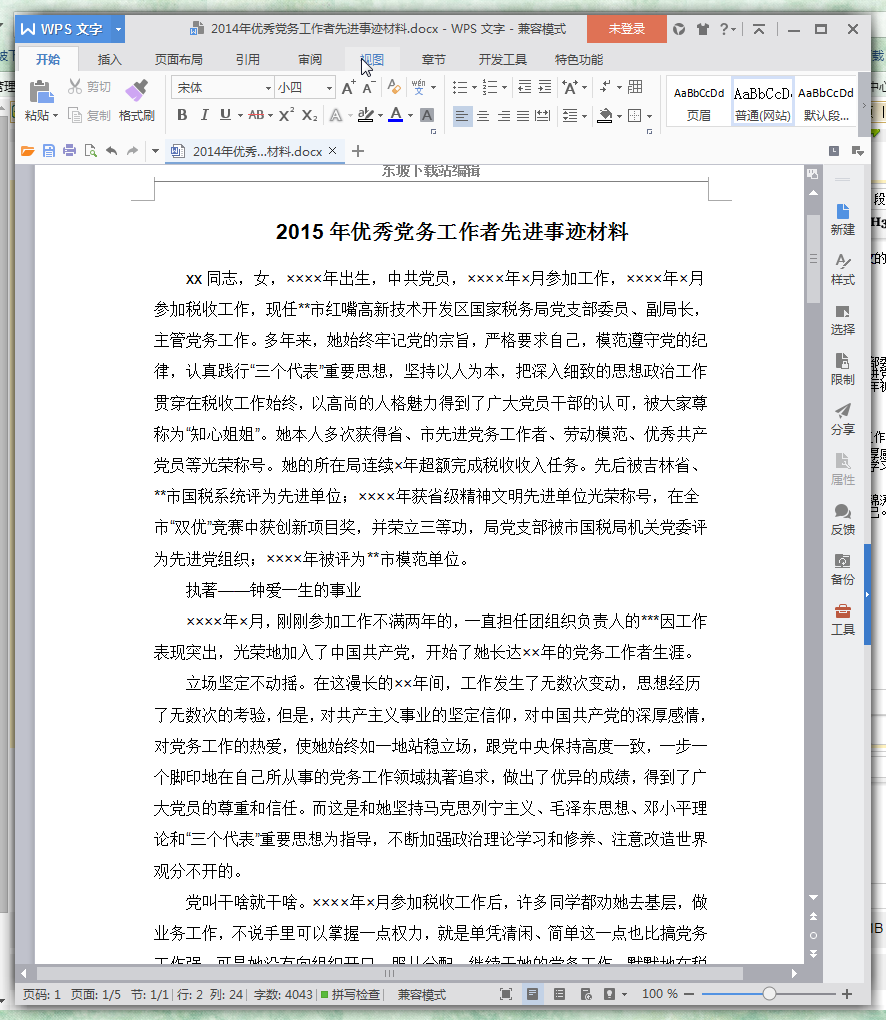 ××××年×月,刚刚参加工作不满两年的,一直担任团组织负责人的***因工作表现突出,光荣地加入了中国共产党,开始了她长达××年的党务工作者生涯。