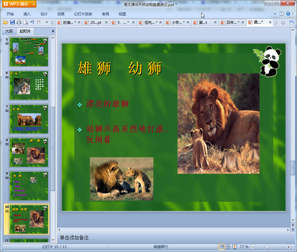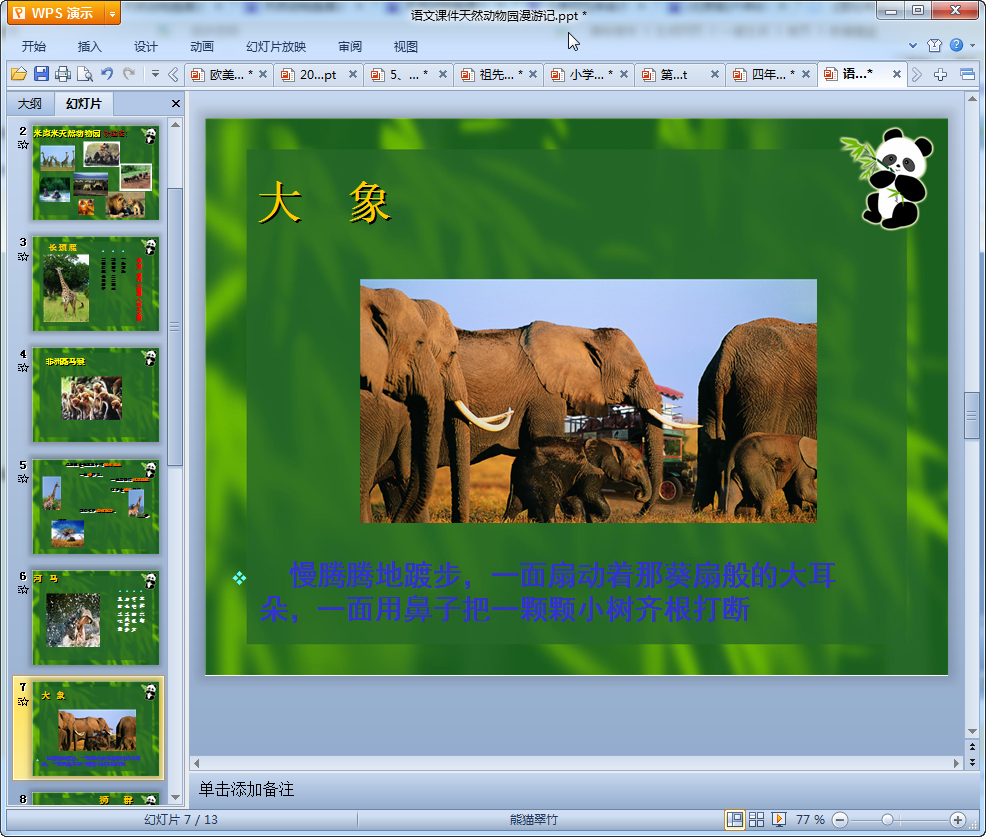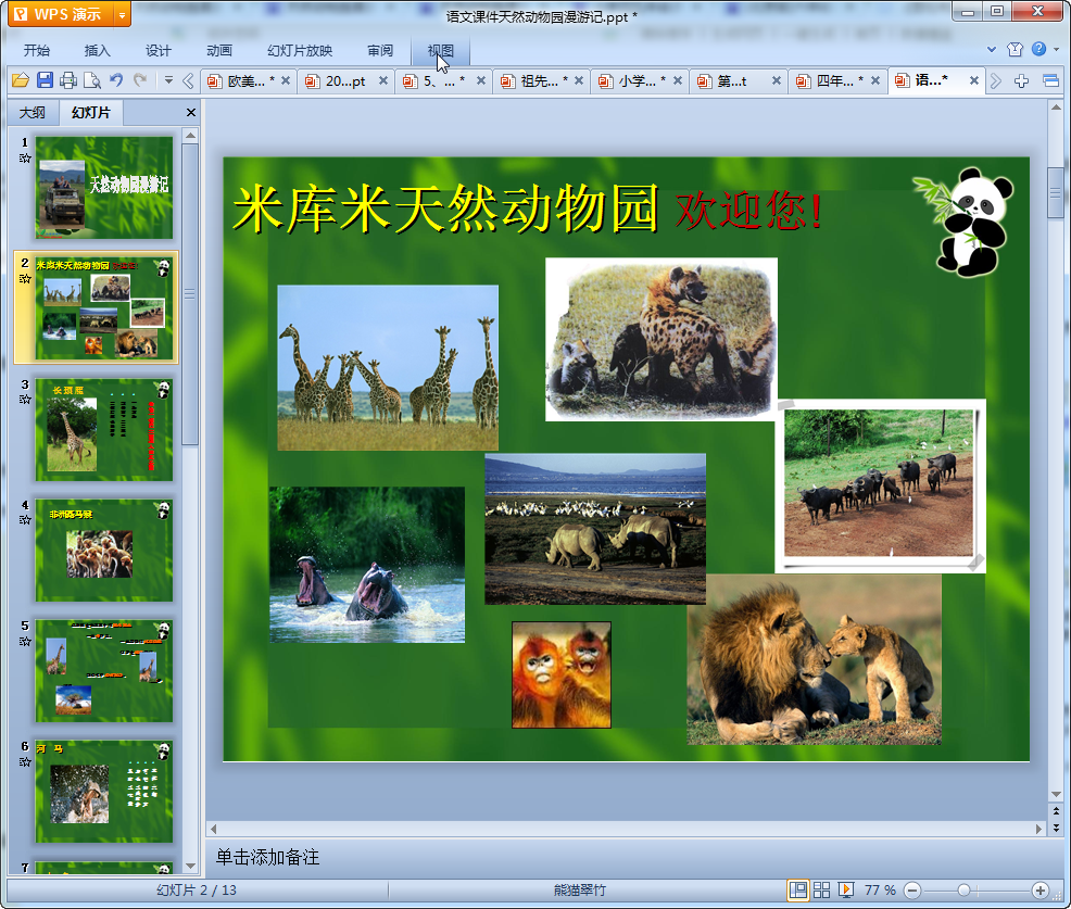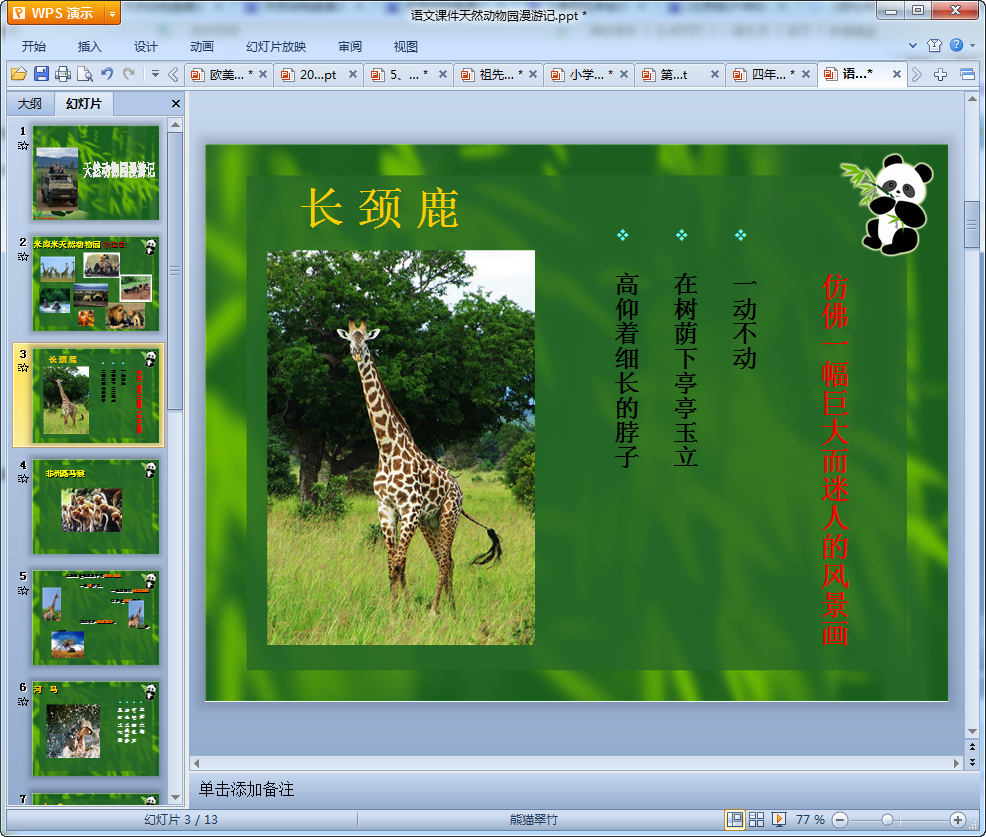 这是在课文天然动物园漫游记教学是时候使用的配套ppt课件,该课件制作十分精美,对课文中的重要知识点讲解的十分完整,大量的动物配图能有效的吸引孩子们的学习兴趣,对该课件感兴趣的老师们可以来我们东坡免费的下载使用!