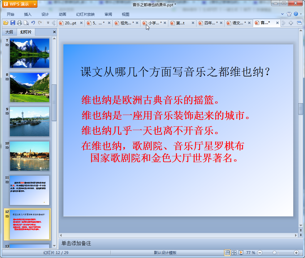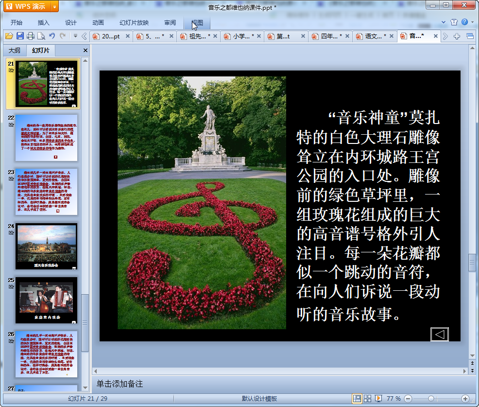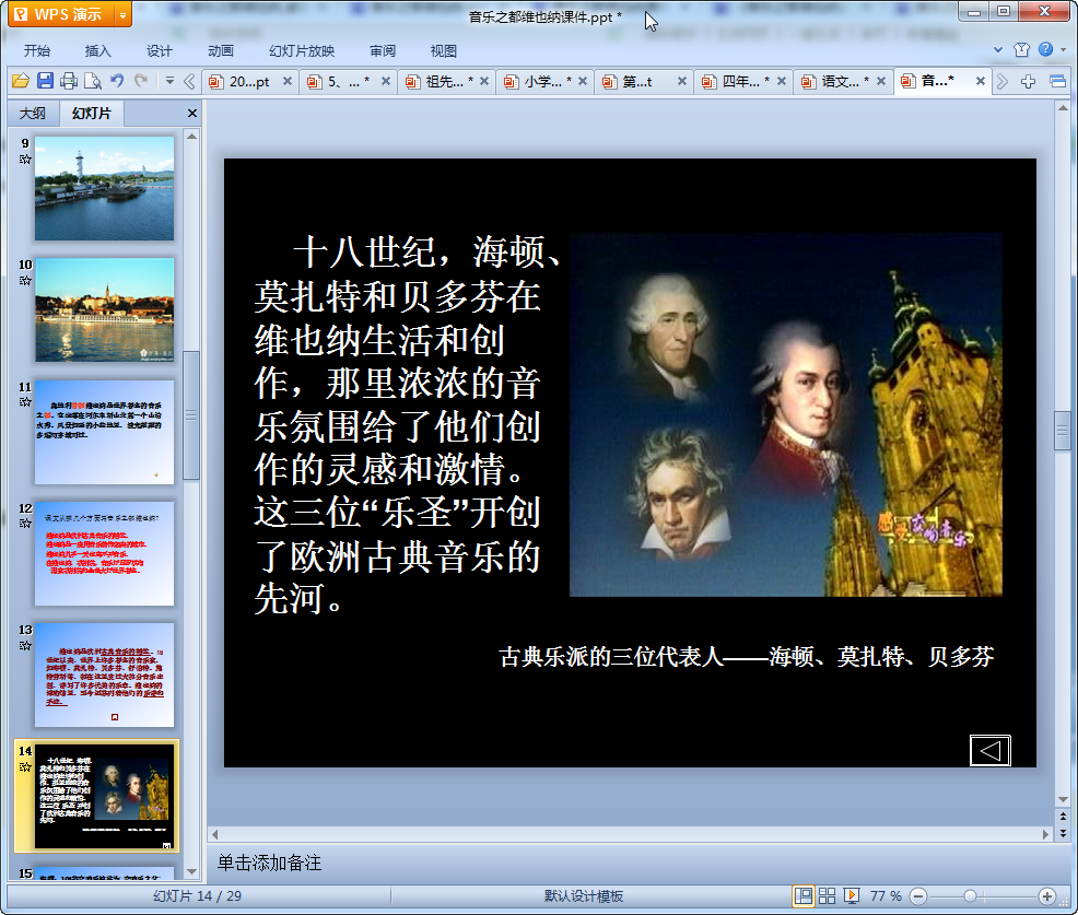 这是我们东坡为大家整理的一篇音乐之都维也纳教学精品课件,课件共有29也内容比较丰富,对课文中的内容描述的比较详细,加上大量的精美配图深受学生老师们的喜欢,有需要该课件的老师们可以来我们这里免费的下载使用!