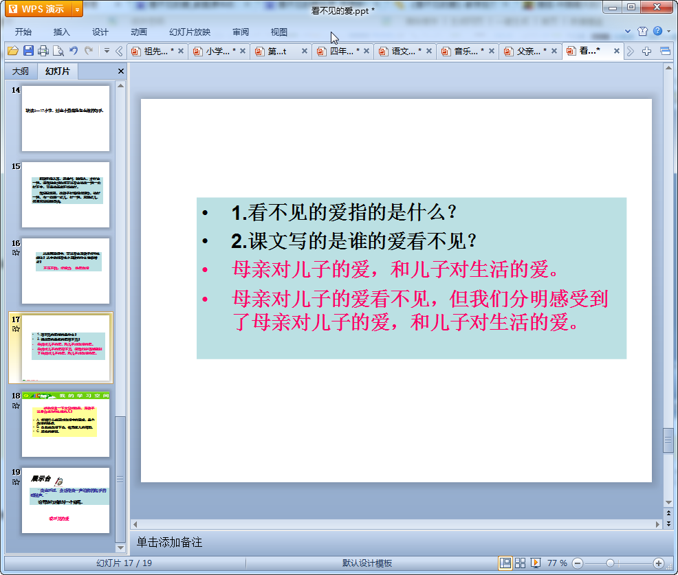 看不见的爱讲述了一个盲人小男孩在打弹弓一直打不到,可他仍不灰心最后成功的故事,这里我们东坡为大家提供一篇该课文的教学ppt看不见的爱教学精品课件,有需要的老师们可以来这里看看免费的下载这篇共19页的看不见的爱ppt!