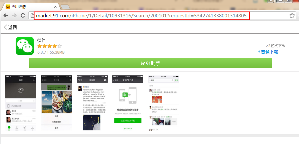 2. 在搜索结果中找到您的APP点击进入页面,此页面的URL就是我们需要的优化连接“http://market.91.com/iPhone/1/Detail/10931316/Search/200101?requestId=5342741338001314805” 在软件中输入以上地址便可进行优化了。(如图)