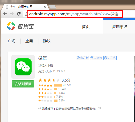 2. 在搜索结果中找到您的APP点击进入页面,此页面的URL就是我们需要的优化连接“http://android.myapp.com/myapp/search.htm?kw=%E5%BE%AE%E4%BF%A1” 在软件中输入以上地址便可进行优化了。(如图)