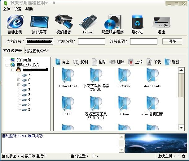 秋天专用远程控制,一款可以远程控制的软件,可以同步监控QQ、MSN聊天记录及电子邮件内容。还具有屏幕监控,语音视频监控、键盘记录读取、屏幕定时录像、屏幕墙、视频墙等功能,有需要的赶紧来东坡下载使用吧。