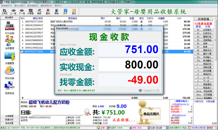 大管家商超收银软件支持商品条形码扫描枪、电子条码秤、小票打印机、顾客显示屏、钱箱功能,使用该软件可以方便地进行进、销、存、及收银的管理,用户权限管理,自定义小票,库存报警提示,报表打印导出,自动备份。