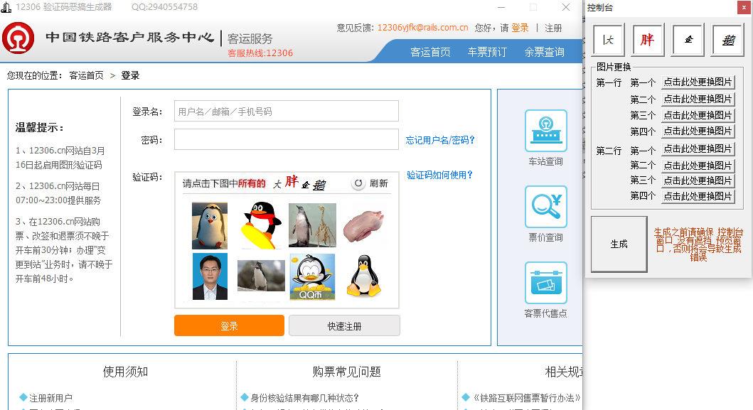 12306验证码恶搞图生成器,本软件仅供参考交流,请下载24小时内删除本软件。因本软件造成的一切后果与作者无关,仅仅只是娱乐娱乐,玩一下的赶紧来下载使用吧。
