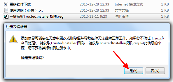 TrustedInstaller是超越管理员权限的最高权限,很多时候我们的文件不能正常修改、删除,就需要这个权限。那么怎么获取TrustedInstaller最高权限呢?这里,小编给大家带来一个reg文件,其实就是导入注册表的小工具,下载解压后,直接运行,然后就可以成功获取TrustedInstaller权限!