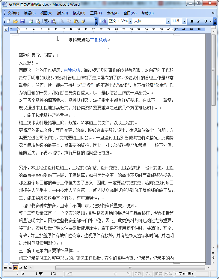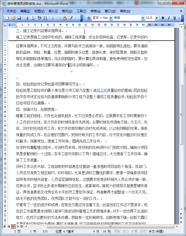 回顾这一年的工作经历,自我总结,通过领导及同事们的支持和帮助,对自己的工作职责有了明晰的认识,对资料管理工作有了更深层次的了解。试验资料的管理工作是非常重要的,任何时候,都来不得办点“马虎”,唱不得半点“高调”,有不得丝毫“侥幸”。作为项目部的一员,我深感自身责任重大,以下是我结合工作的一点感受。