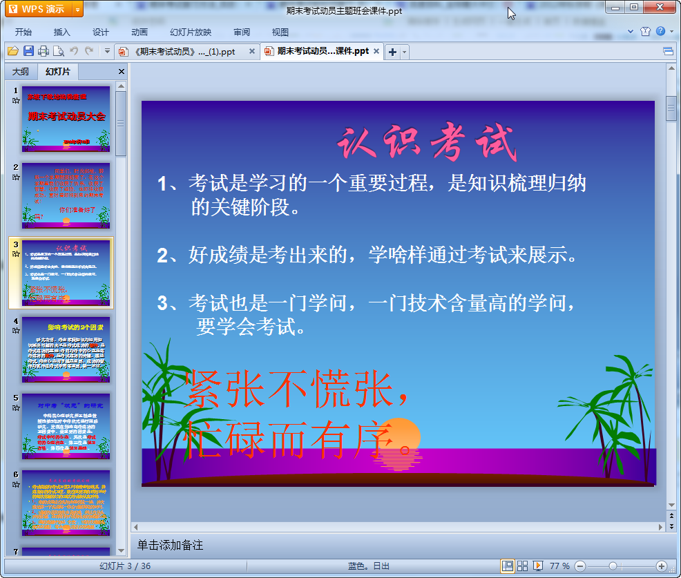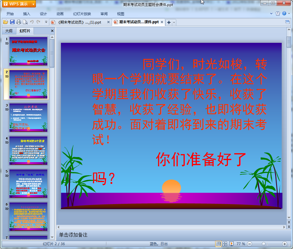 在考试来临直接,老师们需要对学生们的各种情况做出了解,开展一次期末考试动员班会对学生们的学习热情等方面都很有帮助!