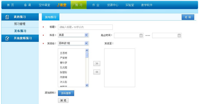 1、老师在【预习】频道内,点击【发布预习】栏目,直接进入发布预习页面;