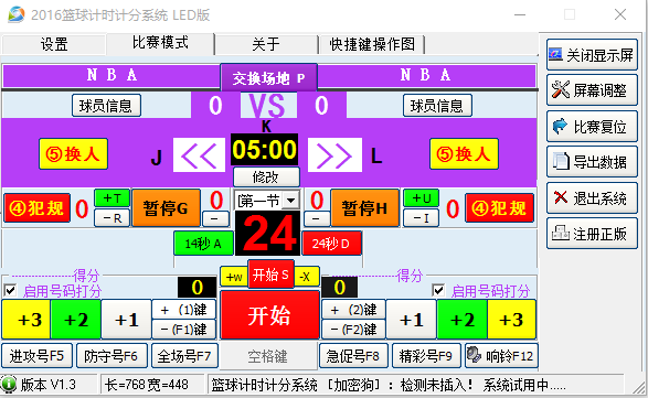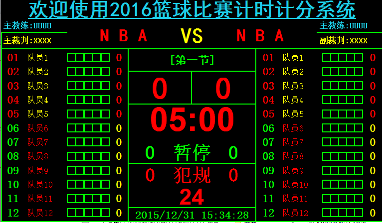 2016篮球计时计分系统LED专用版,完全可以支持所有尺寸的LED屏,除了精准计时、计分、24秒、球员得分、犯规、暂停、进功方向等信息的显示之外,还自带20种场上用到的气氛助场音乐,可以帮助你更好的计分哦,有需要的赶紧来东坡下载使用吧。